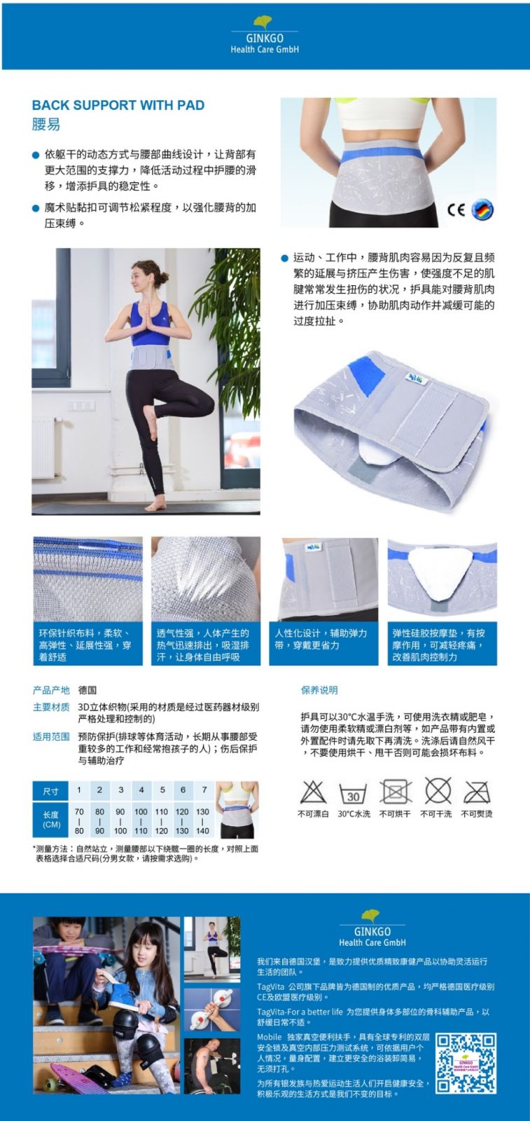 行走,坐立及跑步时使用,避免防止背部疼痛。适用于有背痛,背扭伤,轻度腰间盘突出,肌肉无力或发炎,腰椎轻度退化。适用人群,运动员,老年人,热爱运动人士(如单板爱好者,攀登爱好者),新妈妈,办公室职员及长期伏案工作者,搬运工或经常负重的工种等