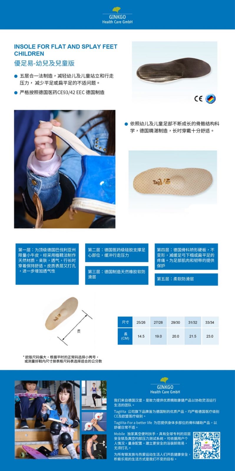 让宝宝迈好人生的每一步!你知道吗,世界上3-6岁的儿童中,44%的孩子有扁平足。德国骨科小牛皮三合一儿童矫正鞋垫,依照人体足部骨骼结构科学,德国精湛骨科矫形工艺制造,舒适,无过敏,减压止痛,矫正姿势,调节足弓与扁平足,内外八字矫正,防臭等优异功能。针对于4-10岁儿童,由于先天性因素而造成的足骨,韧带或肌发育异常; 或后天性因素,例婴儿走路过早,幼儿或儿童长期负重站立,长期卧床不起,足部疾病及肌力失衡等。